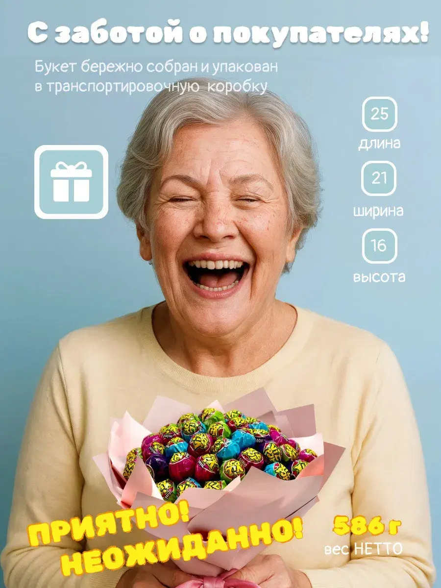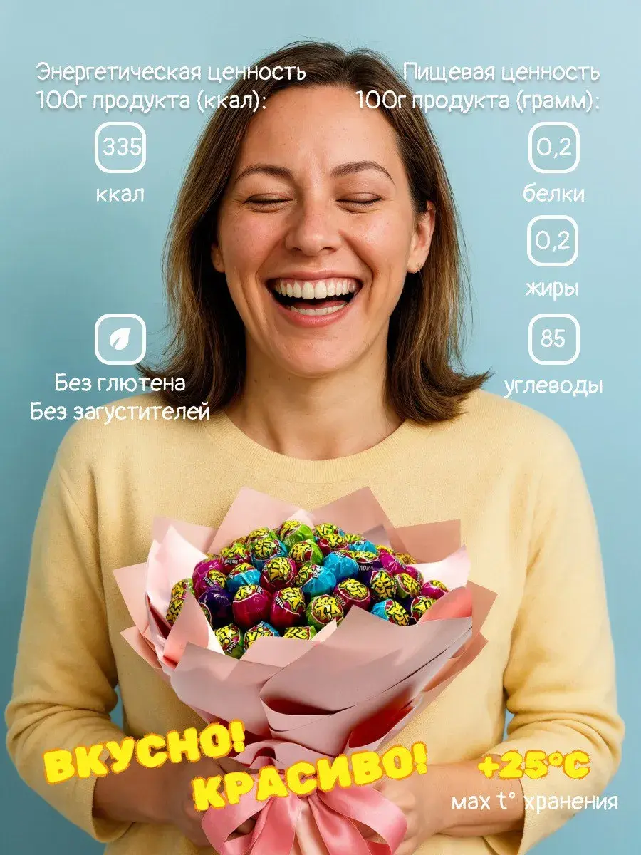 Представьте себе: 61 яркая карамель на палочке, собранная в роскошный букет, который не оставит равнодушным ни девочку, ни девушку, ни женщину.