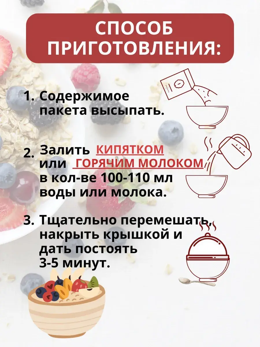 Готовая заварная еда для диетического питания и фитнес похудения. Продукт можно включить в меню кормящих мам или женщинам, снижающим вес, желающим быстро похудеть. Является низкокалорийным готовым продуктом. Крупа овсянка и другие злаки в одноразовых пакетиках подходит для всех постный, веганский и вегетарианский образ жизни, в дорогу, в поезд, в поход, в офис.