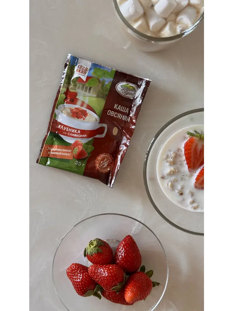 Каша с клубникой. Состав:хлопья овсяные (не требующие варки), сахар, соль поваренная пищевая, сливки сухие растительного происхождения, крахмал картофельный, соль поваренная пищевая, кусочки сушеной клубники, регулятор кислотности (лимонная кислота), ароматизатор пищевой «Ванилин», «Клубника» (идентичный натуральному), краситель пищевой «Кармуазин».
