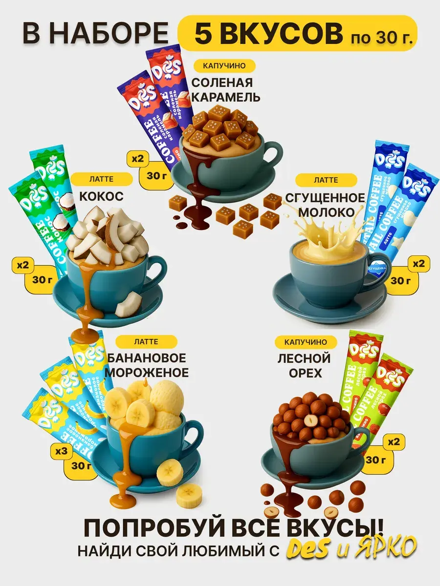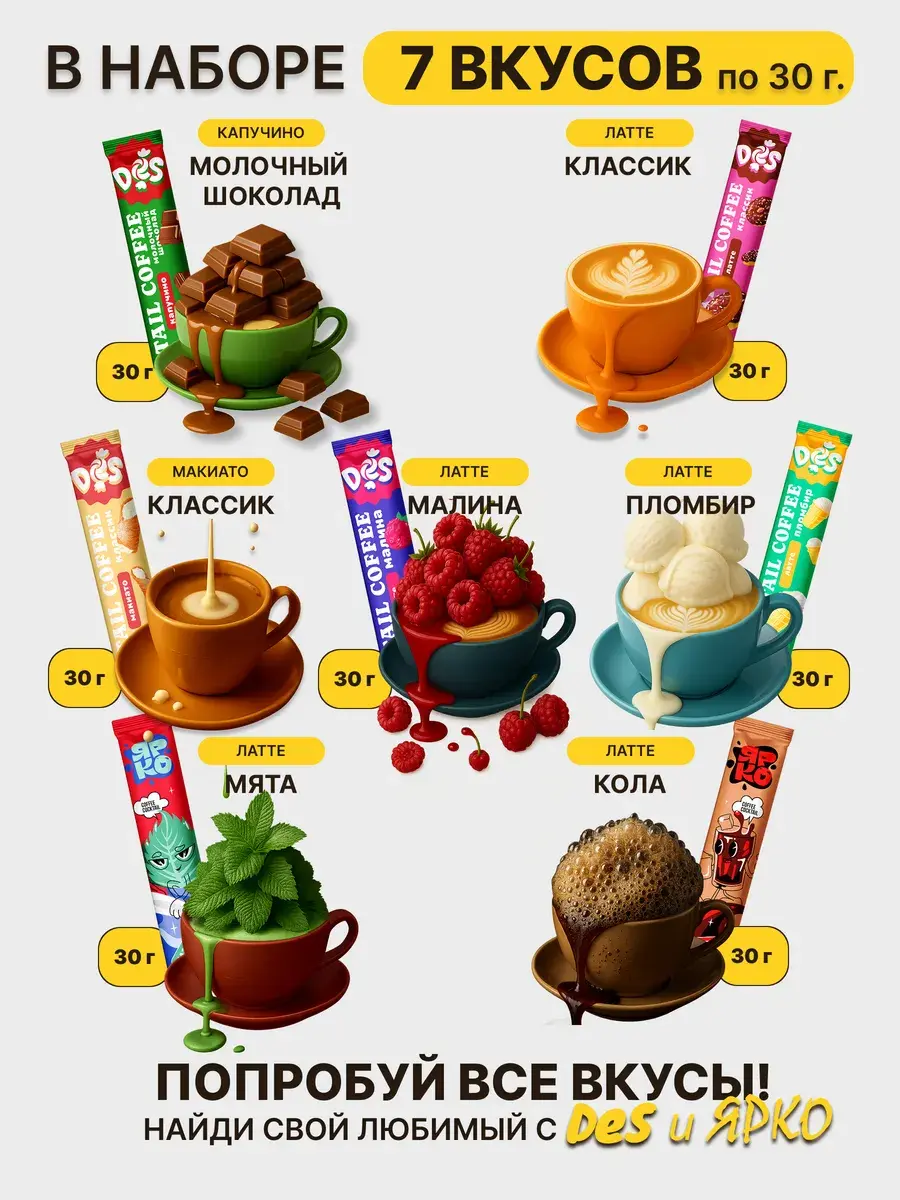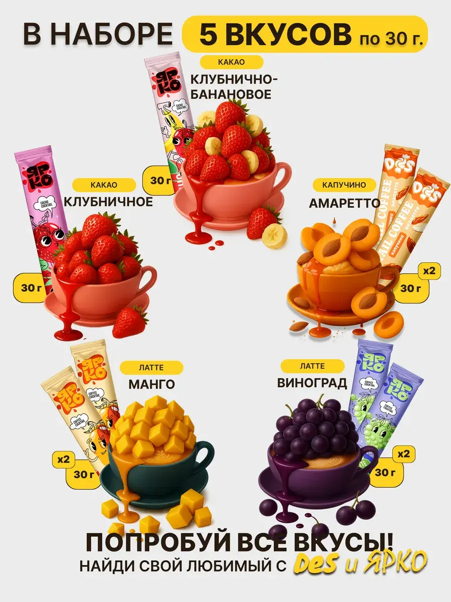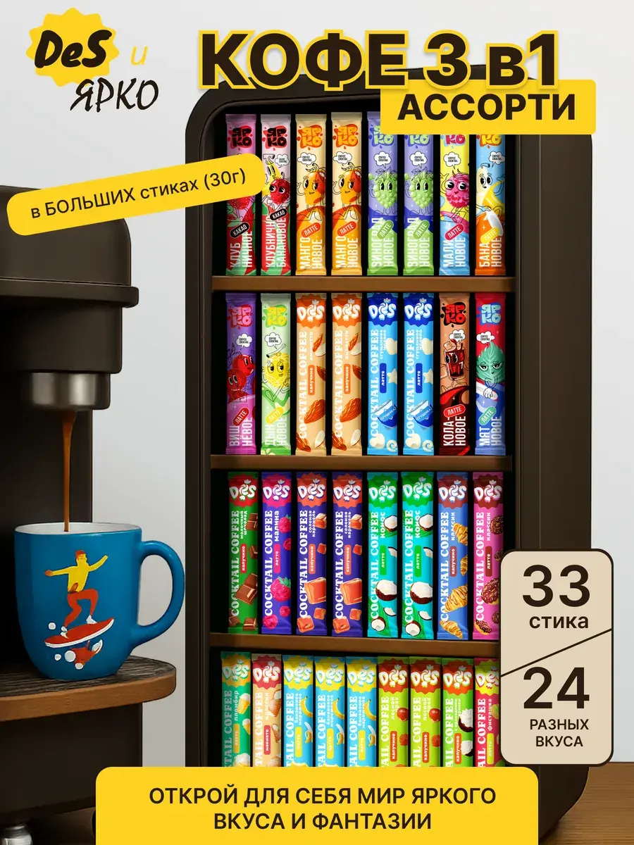 В наборе представлено 24 разных вкуса: от классического кофе до ярких фруктовых и десертных миксов. Такой ассортимент позволит каждый день открывать для себя новый вкус и настроение. Удобный формат стиков делает приготовление простым: достаточно залить содержимое горячей водой — и готово!