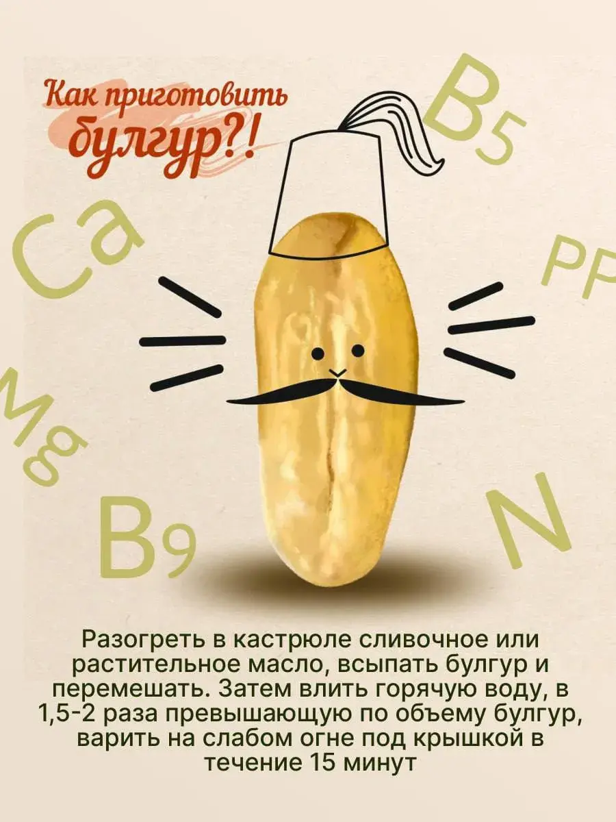 Булгур: Золотистые зерна пшеницы твердых сортов! Быстроразваривающаяся, сытная крупа с приятной текстурой и ореховым оттенком. Основа для табуле, отличный гарнир к мясу и овощам, добавка в супы.