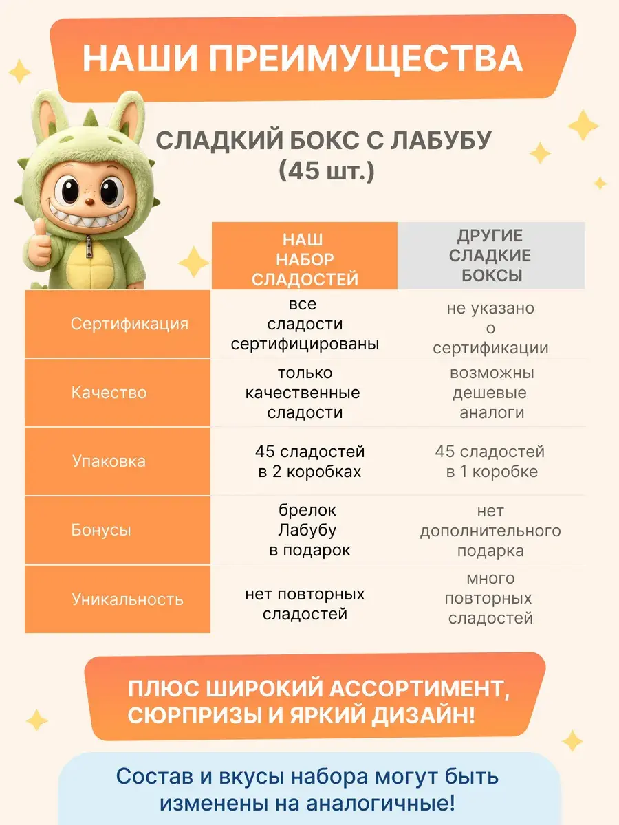 Любите необычные подарки? Вы ищете идеальный подарок, который принесет улыбки и радость как детям, так и взрослым? Тогда наш "Сладкий бокс" для вас - восхитительный и очаровательный подарок для всех возрастов! В этой коробочке собрался настоящий микс из огромного количества разноцветных сладостей. Наполнение коробок многообразно: кислые, фруктовые, жевательные, шоколадные, мармеладные сладости, никогда не угадаешь, что тебя ждёт. «Коробка сладостей» — это больше, чем просто набор вкусных угощений; это сердечный жест, который передает вашу заботу, я нашими сладостями вы будете желанным гостем для ребенка и взрослого.