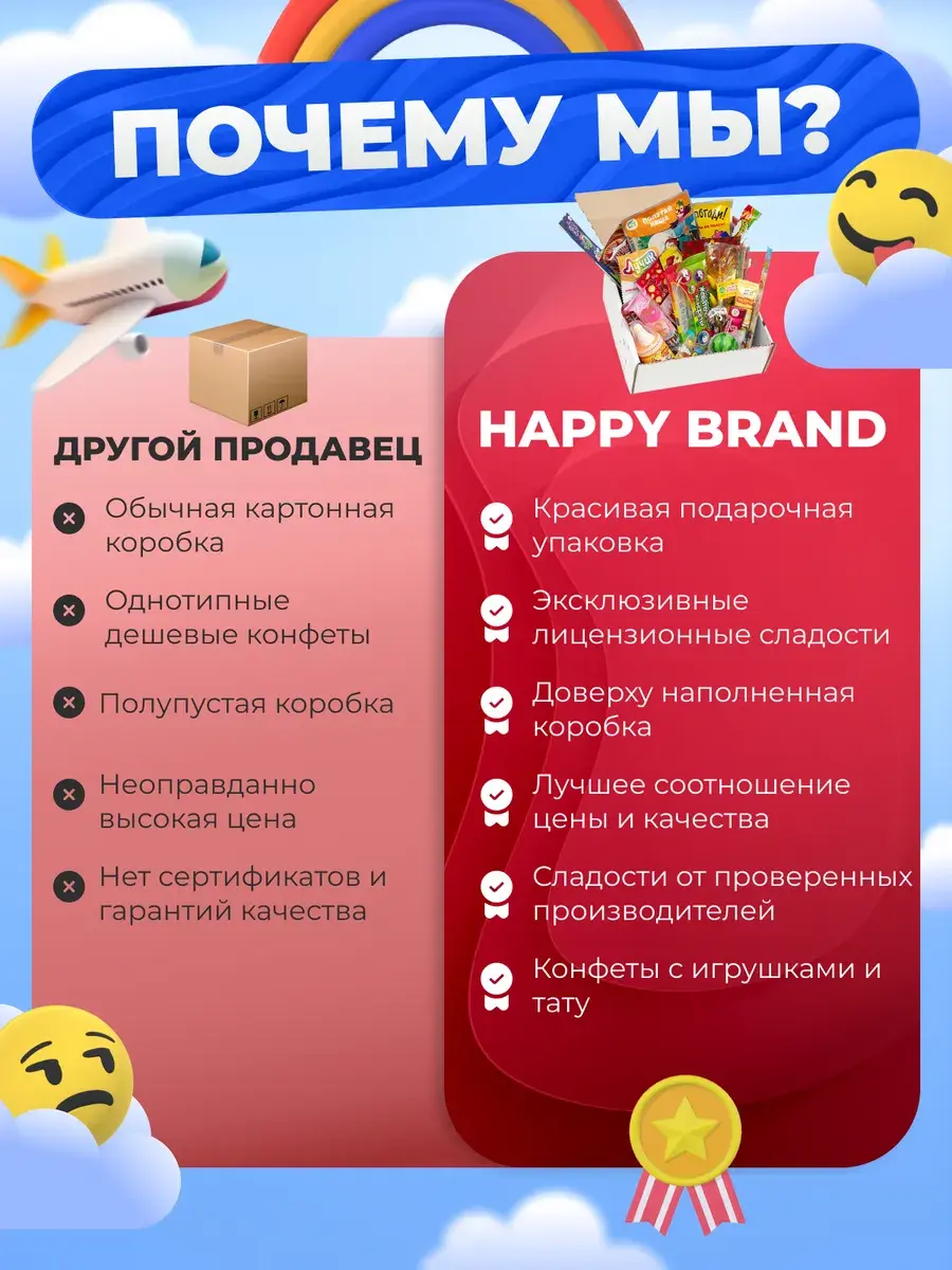 В наборе могут быть замены без потери ценности. Периодически мы меняем состав для того, чтобы у вас была возможность пробовать новые вкусы. Нас выбирают садики и школы, которые ценят качество подарочный наборов. Наш бокс купили более 5000 раз. Будь то празднование День Рождения, Новый год, 8 марта, дня Святого Валентина, День Влюбленных корпоратива или тематической вечеринки и даже без повода- эта коллекция сладостей —лучший способ передать свои эмоции и порадовать своих близких.