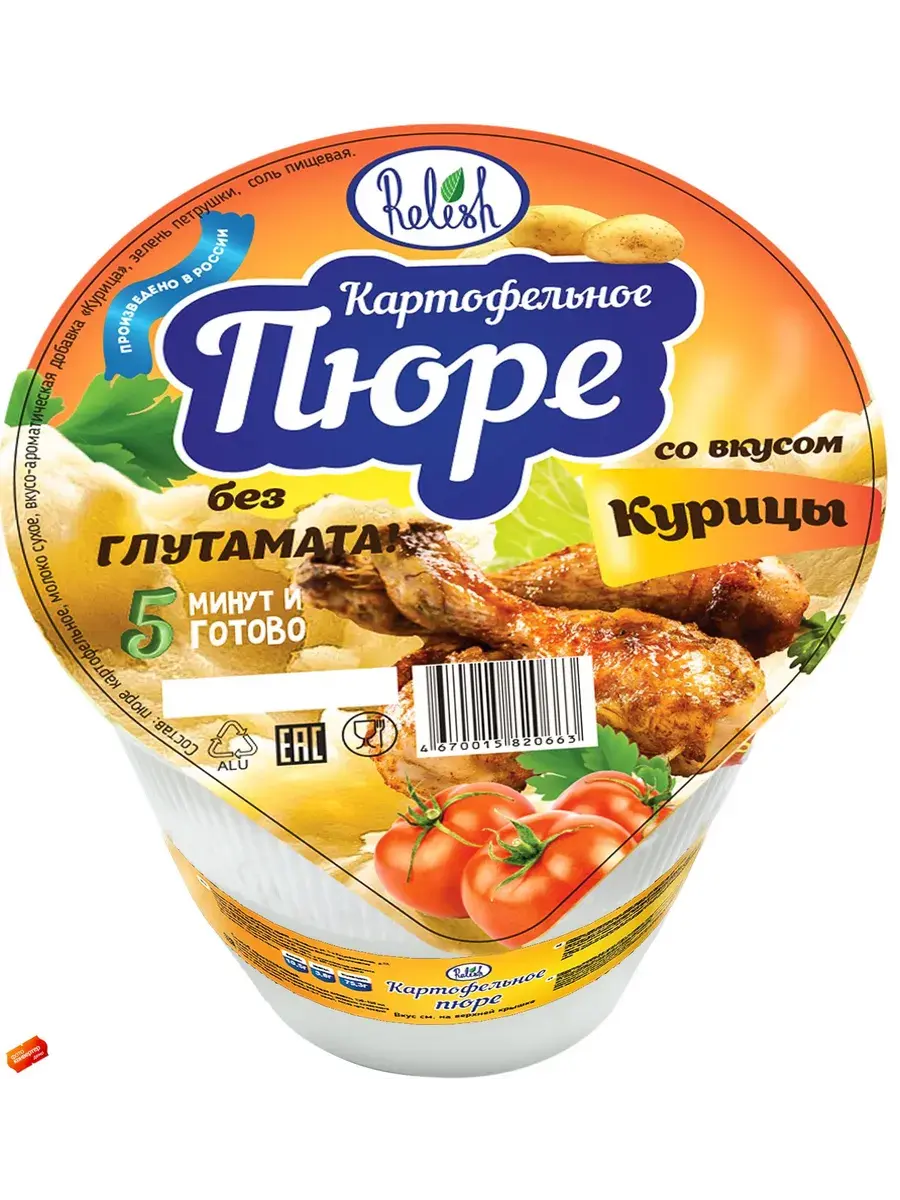 Пюре картофельное "со вкусом курицы" - это продукт быстрого приготовления, который позволяет значительно сэкономить время. Если у вас нет времени на приготовление обеда - картофельное пюре с гренками от бренда 'Relish' поможет быстро утолить голод! Удобную упаковку можно взять с собой в путешествие или офис.